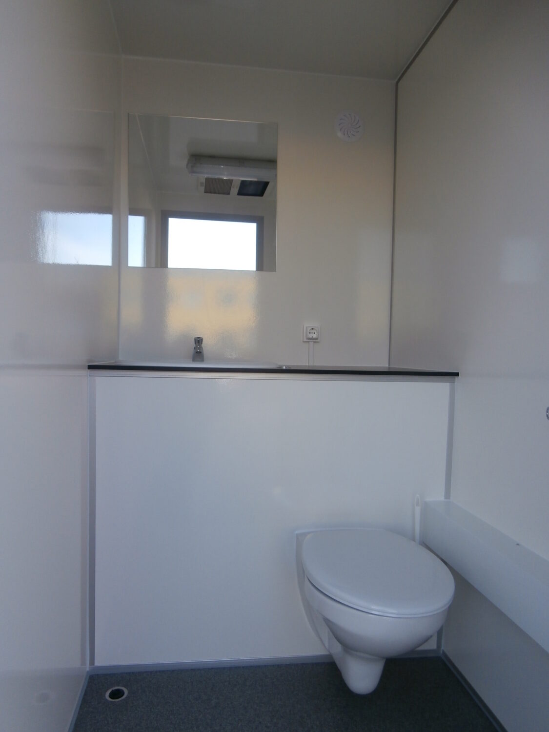 Damen: 1 WC, Handwaschbecken mit Armatur, Handtuch- und Seifenspender, niedriger Sicherheitseinstieg